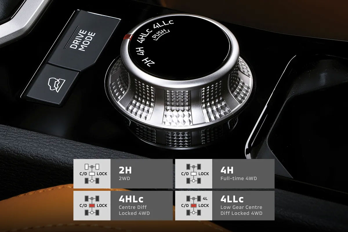 Mitsubishi Motors’ one and only Super Select 4WD-II system provides exceptional all-terrain performance with its four selectable modes, including 4H (full-time 4WD) that delivers great stability even on wet surfaces, and outstanding cornering performance even on dry pavement.